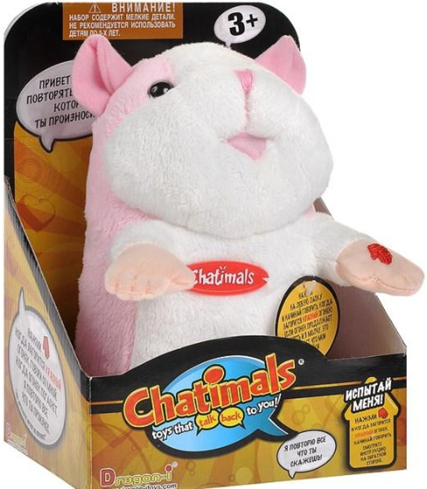 Интерактивная игрушка говорящий хомяк Chatimals производится фирмой Dragon-I. Хомяк сделан из пластика и искусственного меха, который приятен на ощупь. Игрушка высотой девятнадцать сантиметров, оранжево-белого цвета. Предназначен для детей свыше трех лет, а также подростков и взрослых.